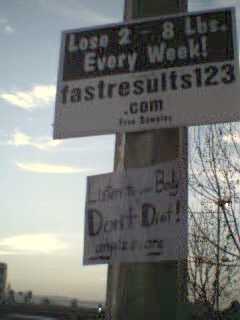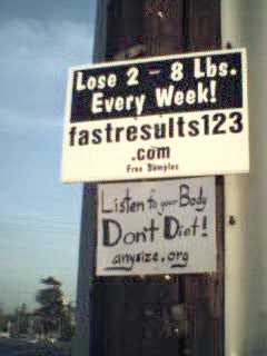 I have felt for a while that making size-acceptance signs would be a great way to combat weight-loss signs. Here are a few of my ideas. Please let me know what you think of them, and send your own ideas. Once these are made and posted, I'll put some pictures up.